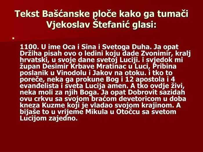 Tekst ispisan na ploči postao je važan izvor informacija o razvoju hrvatskog glagoljskog pisma, hrvatskog jezika i kulture. Potvrdio je postojanje hrvatske države od najranijih dana, spominje ime hrvatskog kralja Dmitra Zvonimira (1076. – 1089.), te obilježava sjeverne granice njegova kraljevstva na otoku Krku. Tekst ploče pročitan je djelomično 1865. a sasvim 1875.