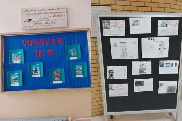 Osnovna škola Dinka Šimunovića Hrvace prigodno je jutros proslavila Dan sjećanja na sve žrtve Domovinskog rata i Dan sjećanja na žrtvu Vukovara i Škabrnje u prostorijama škole. Ravnateljica Nevenka Jenjić organizirala je prigodni program  u kojem smo se iznova sjetili dana kada je 1991. godine slomljena herojska obrana Vukovara, počinjen pokolj u Škabrnji te kada su svoje junaštvo iskazali branitelji na cijelom području Lijepe naše.
