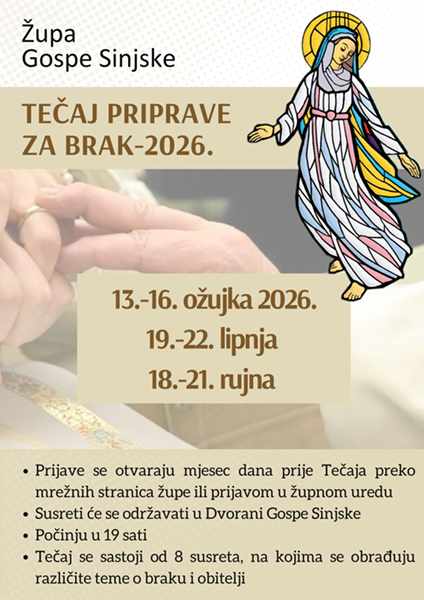 Župa Gospe Sinjske organizira 1. Tečaj priprave za brak u 2026. godini. Tečaj će se održavati od 13.-16. ožujka u 19 sati u Dvorani Gospe Sinjske.