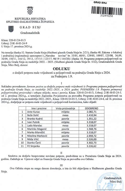 Gradonačelnik Grada Sinja, Miro Bulj, donio je Odluku kojom je utvrđen konačan popis korisnika i iznosi dodijeljenih potpora male vrijednosti u poljoprivredi za 2024. godinu. Odluka obuhvaća potporu za korisnike u Podmjeri 1.9., koja se odnosi na primarnu poljoprivrednu proizvodnju i otkup mlijeka, mesa i povrća. Odluka je donesena na temelju provedenog javnog poziva i Zapisnika Povjerenstva za provedbu Programa potpora poljoprivredi na području Grada Sinja za razdoblje 2022. – 2025.