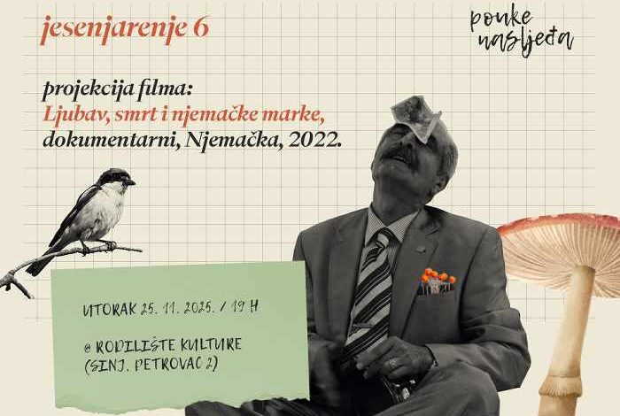 U utorak 25. 11. s početkom u 19 sati u sinjskom Rodilištu kulture održat će se projekcija dokumentarnog filma: Ljubav, smrt i njemačke marke (Njemačka, 2022.,99′). Projekcija je dio ovogodišnjeg programa Jesenjarenje koje za temu ima “Pouke nasljeđa”. Ulaz je slobodan.