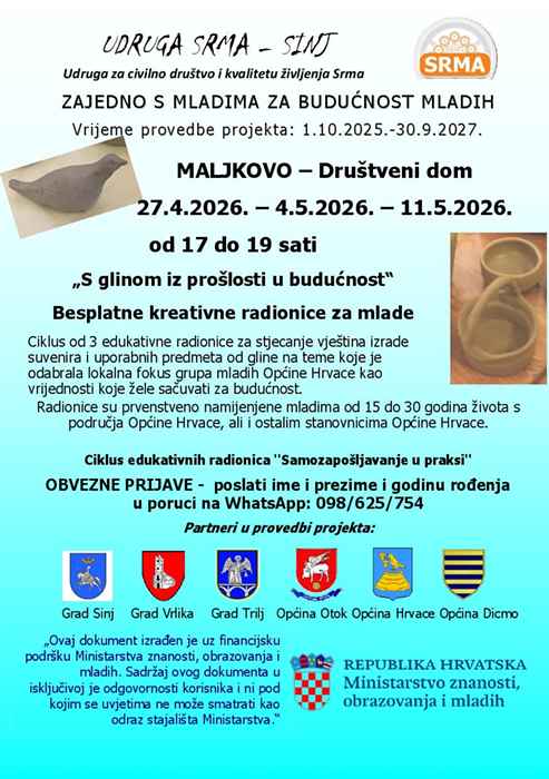 Danas u Društvenom domu u Maljkovu od 17 do 19 sati imaju besplatnu kreativnu radionicu za mlade “S glinom iz prošlosti u budućnost”. Radionica će se odvijati 4. i 11. svibnja.