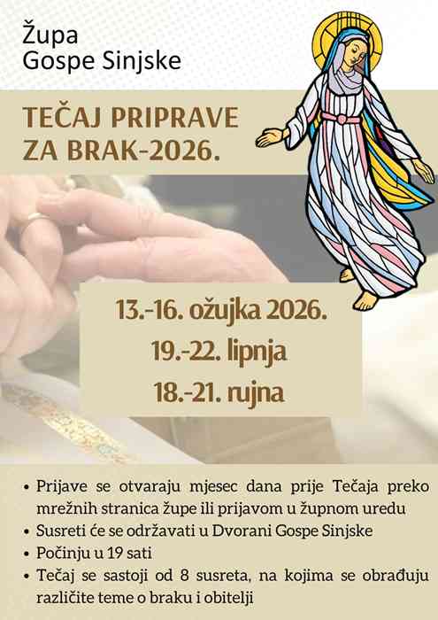 Župa Gospe Sinjske nastavlja s organizacijom zaručničkih tečajeva i u 2026. godini.