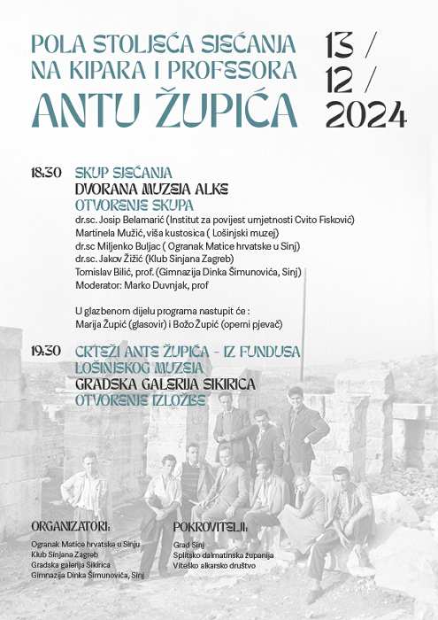 Ovaj petak, s početkom u 18 sati i 30 minuta u Alkarskim dvorima održat će se prigodni skup ”Pola stoljeća sjećanja na kipara i profesora Antu Župića’‘, kipara i profesora čiji je izniman pedagoški i umjetnički rad ostavio trajan utjecaj na grad Sinj i Cetinsku krajinu. Na Skupu će o stvaralaštvu i životu Ante Župića govoriti njegovi prijatelji, kolege, ali i eminentni stručnjaci iz područja povijesti umjetnosti – dr. sc. Joško Belamarić, dr. sc. Miljenko Buljac, dr.sc. Jakov Žižić, Martinela Mužić, viša kustosica Lošinjskog muzeja te Tomislav Bilić, prof. i ravnatelj Opće gimnazije Dinka Šimunovića, u kojoj je profesor Župić proveo godine rada odgajajući i obrazujući generacije gimnazijalaca. Skup će moderirati dugogodišnji profesor sinjske gimnazije ujedno i blizak prijatelj Ante Župića, profesor Marko Duvnjak. U glazbenom dijelu programa nastupiti će Marija Župić na glasoviru i Božo Župić, operni pjevač.