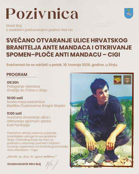 Grad Sinj organizira svečanost otvaranja Ulice hrvatskog branitelja Ante Mandaca – Cige te otkrivanje spomen-ploče u njegovu čast, koje će se održati u petak, 10. travnja 2026. godine u Sinju kod Fantazije.