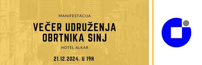 Obrtnici Sinja, Trilja, Vrlike, Otoka, Hrvaca i Dicma pozivamo vas na manifestaciju Večer Udruženja obrtnika Sinj koja će se održavati u hotelu Alkar 21.12.2024. (subota) u 19 sati.