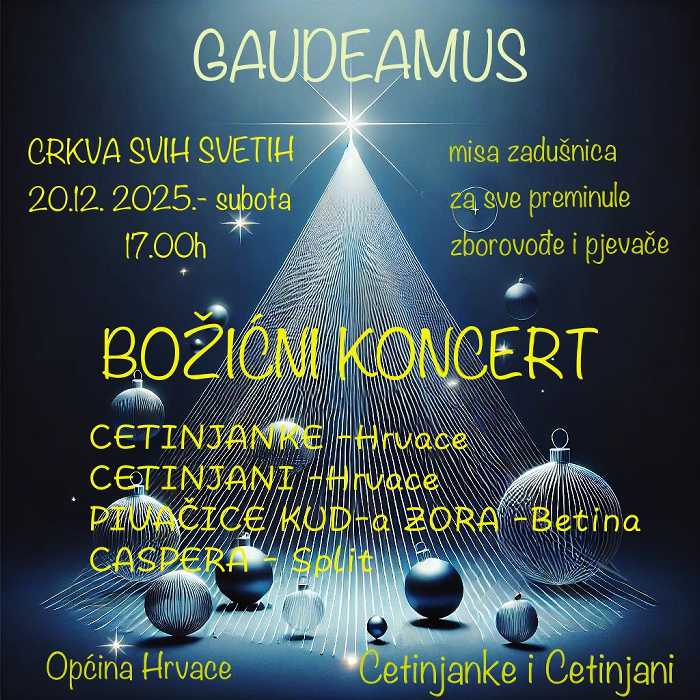 Gaudeamus donosi poseban spoj glazbe, duhovnosti i zajedništva, na kojem ove godine sudjeluju četiri klape: Klapa Caspera iz Splita, Klapa KUD-a Zora iz Betine na otoku Murteru, te Klapa Cetinjani i Klapa Cetinjanke iz Hrvaca. Sudionici tijekom dana rade kao veliki zbor, ali i u manjim skupinama, usvajajući nove skladbe i razvijajući vokalne vještine. Budući da je repertoar isključivo duhovnog karaktera, program će biti dodatno obogaćen misom zadušnicom za sve preminule zborovođe i pjevače, nakon čega slijedi svečani božićni koncert u crkvi Svih Svetih u Hrvacama. Gaudeamus predstavlja rijetku priliku za pjevanje u velikom zajedničkom zboru i pruža iskustvo koje pjevači pamte cijeli život.